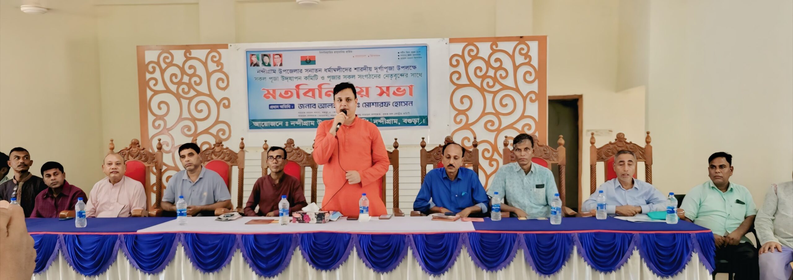 মানুষ মানুষের জন্য, অন্যের বিপদে যে এগিয়ে আসে সেই প্রকৃত মানুষ। সে যেই ধর্মের ওই হোক না কেন একজনের বিপদে আরেকজন এগিয়ে আসবে এটাই মহত্ত্বের পরিচয়। ইতিমধ্যেই যা সারা বাংলাদেশে বিএনপি হিন্দু ভাইদের জানমাল রক্ষা, মন্দির পাহারা সহ তাদের পাশে থেকে করিয়ে দেখিয়ে দিয়েছে। আওয়ামী ফ্যাসিস্ট সরকার পালিয়ে গেলেও তাদের পেতাত্মারা ষড়যন্ত্রে লিপ্ত রয়েছে। আসছে সামনে শারদীয় দুর্গোৎসব। এই উৎসবে পেতাত্মারা কোথাও যেন অপ্রীতিকর ঘটনা না ঘটাতে পারে এজন্য দেশনায়ক তারেক রহমানের নির্দেশে দূর্গা উৎসব শুরু থেকে শেষ না হওয়া পর্যন্ত সারা বাংলাদেশে বিএনপি পরিবার আপনাদের পাশে থেকে সুরক্ষা দিবে। ইতিমধ্যেই আমার নন্দীগ্রাম কাহালু নির্বাচনী এলাকার সকল নেতাকর্মীদের মেসেজ দিয়েছি পূজা শুরু থেকে শেষ পর্যন্ত পূজা মন্ডপ পরিদর্শন করা সহ আপনাদের সার্বিক বিষয়ে তারা খোঁজখবর নিবে।সনাতন ধর্মাবলম্বীরা আমাদের ভাই আমাদেরই বোন, তারাও এদেশের অংশ, তাদের অধিকার খর্ব হয় কিংবা তাদের ধর্মীয় উৎসবে বাধা সৃষ্টি হয় এমন কর্মকাণ্ড হতে আমাদের সকলকে বিরত থাকতে হবে। সনাতন ধর্মাবলম্বীদের অধিকার রক্ষাসহ তাদের সকল ধর্মীয় উৎসবে বাংলাদেশ জাতীয়তাবাদী দল পূর্বেও সঙ্গে ছিল, এখনো আছে এবং ভবিষ্যতেও থাকবে।শারদীয় দূর্গাপূজা উৎসব উপলক্ষ্যে ২২শে সেপ্টেম্বর (সোমবার) বেলা ১১টায় উপজেলা অডিটোরিয়ামে উপজেলা উদযাপন কমিটির সঙ্গে মতবিনিময় সভায় প্রধান অতিথির বক্তব্যে উপরোক্ত কথাগুলো বলেন বগুড়া জেলা বিএনপির ভারপ্রাপ্ত সাধারণ সম্পাদক ও বগুড়া ৪ আসনের সাবেক সংসদ সদস্য আলহাজ্ব মোশাররফ হোসেন। পূজা উদযাপন পরিষদের সাধারণ সম্পাদক সুকুমার চন্দ্র রায়ের সভাপতিত্বে এবং নন্দীগ্রাম উপজেলা বিএনপির সাধারণ সম্পাদক বেলায়েত হোসেন আদর এর সঞ্চালনায় বক্তব্য রাখেন উপজেলা বিএনপির সভাপতি আলাউদ্দিন সরকার, উপজেলা বিএনপির সাংগঠনিক সম্পাদক আব্দুল হাকিম, ইয়াছিন আলী, সাবেক মেয়র ও উপজেলা কৃষকদলের সভাপতি সুশান্ত কুমার শান্ত,উপজেলা পূজা উদযাপন পরিষদের ভারপ্রাপ্ত সভাপতি মহানন্দ রায় মহান, সহ-সভাপতি ভারত চন্দ্র প্রাং, পৌর বিএনপির সভাপতি আলেকজান্ডার, সাধারণ সম্পাদক শফিউল আলম সুমন, উপজেলা যুব দলের সিনিয়র যুগ্ম আহবায়ক আব্দুর রউফ রুবেল, যুগ্ম আহবায়ক আরিফুল ইসলাম মজনু, গোলাপ হোসেন, পৌর যুব দলের আহবায়ক গোলাম রব্বানী, সিনিয়র যুগ্ম আহবায়ক মেহেদী হাসান শাহীন, উপজেলা স্বেচ্ছাসেবক দলের আহবায়ক আবু বক্কর সিদ্দিক রঙিন, যুগ্ম আহবায়ক মোঃ কোরবান আলী, মতিউর রহমান মুসা, ভারপ্রাপ্ত সদস্য সচিব আব্দুল হাকিম রিন্টু, পৌর স্বেচ্ছাসেবক দলের সদস্য সচিব সিয়ামুল হক রাব্বী, উপজেলা ছাত্র দলের সভাপতি জুয়েল রানা, সহ সভা
