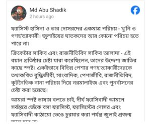 তিনি লেখেন—ক্রিকেটার সাকিব এবং রাজনীতিবিদ সাকিব আলাদা- এই বয়ান প্রতিষ্ঠার চেষ্টা যারা করেছিলেন, তাদের উদ্দেশ্য জাতির কাছে স্পষ্ট। একইভাবে বিভিন্ন পেশার গণহত্যাকারীদেরকে তথাকথিত বুদ্ধিজীবী, সাংবাদিক, পেশাজীবী, রাজনীতিবিদ, কূটনৈতিক নানা পরিচয় দিয়ে নরমালাইজ এবং পুনর্বাসনের চেষ্টা করা হয়েছে।