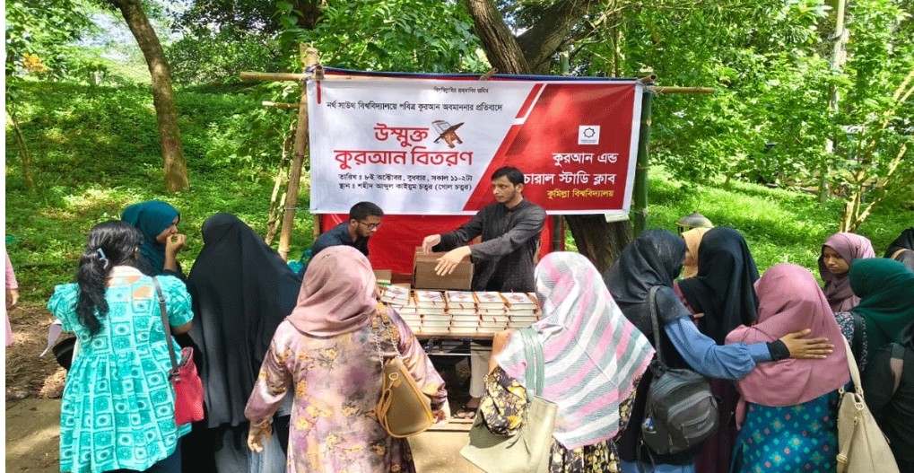 কুমিল্লা বিশ্ববিদ্যালয়ে (কুবি) নর্থ সাউথ বিশ্ববিদ্যালয়ে পবিত্র কোরআন অবমাননার প্রতিবাদে উন্মুক্ত কোরআন বিতরণ কর্মসূচি পালন করেছে কুমিল্লা বিশ্ববিদ্যালয়ের কোরআন অ্যান্ড কালচারাল স্টাডি ক্লাব।