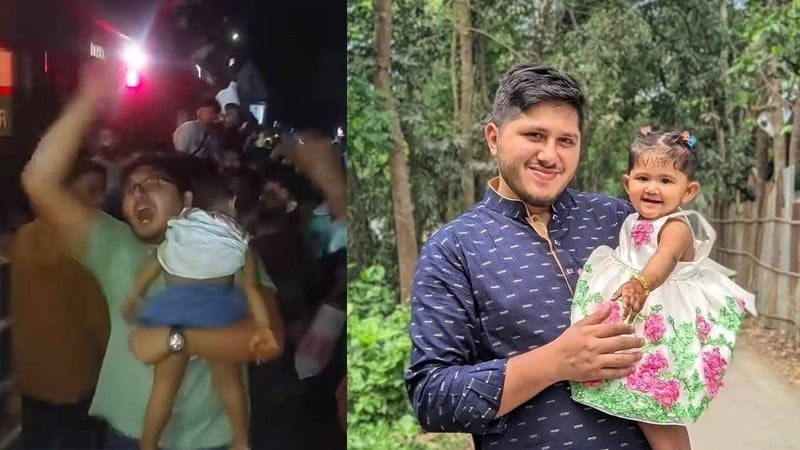 নিহত আয়েশার বয়স মাত্র দুই বছর। গায়ে ছিল সাদা ফ্রক, পরনে নীল হাফ প্যান্ট। দুর্ঘটনার পর শিশুটিকে কোলে নিয়ে ছুটে আসেন বাবা সাজ্জাদুন নূর। দূর থেকে দেখলে মনে হচ্ছিল, আয়েশা বাবার কোলে ঘুমিয়ে আছে। কিন্তু কাছে গিয়ে দেখা যায়—শিশুটির মাথা ফেটে গেছে, রক্তে ভেসে যাচ্ছে বাবার টি-শার্ট। মুখে বারবার উচ্চারণ করছিলেন, “আল্লাহু আকবর, আল্লাহু আকবর।”