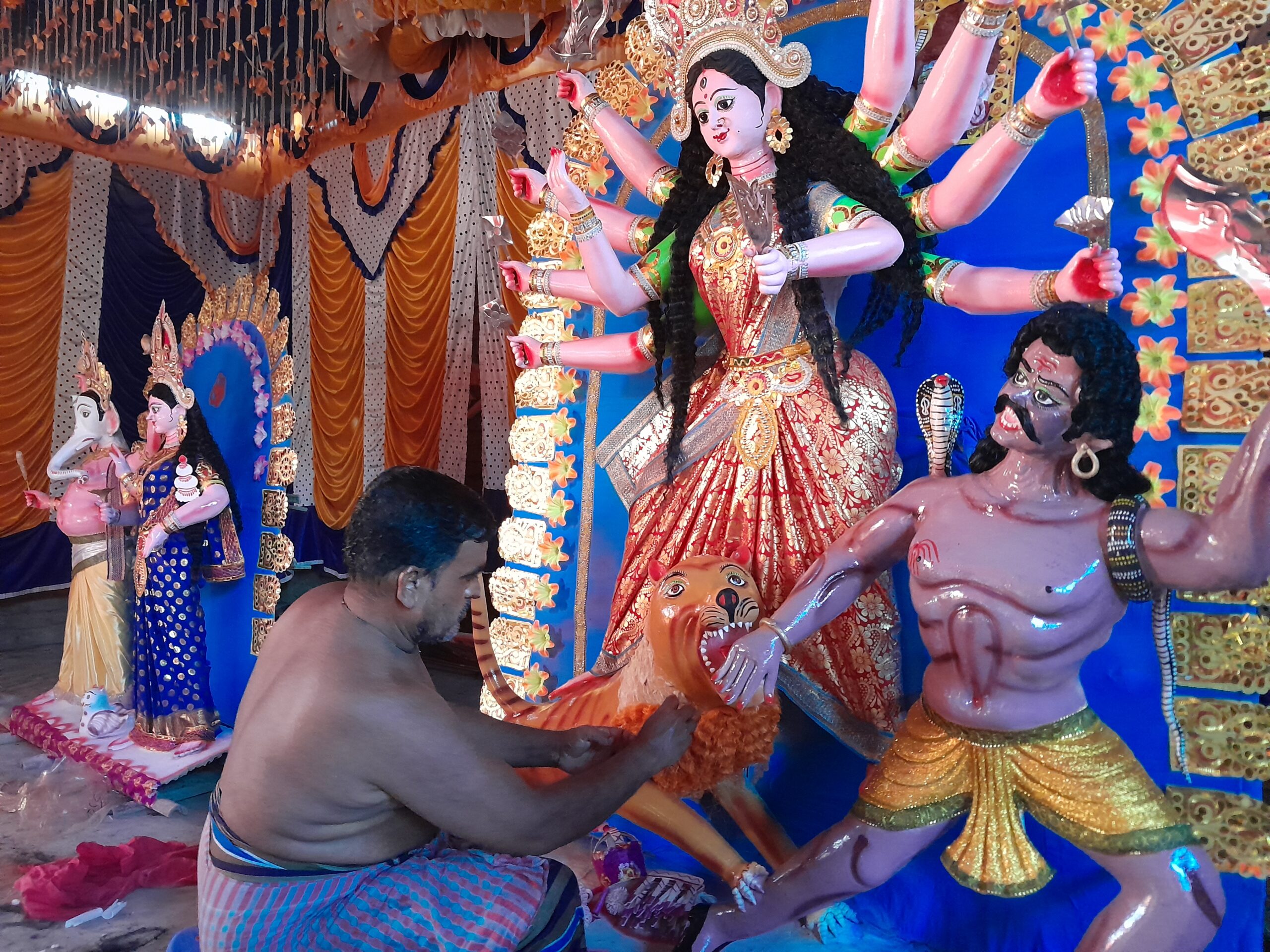 বগুড়ায় শিল্পীর রং-তুলির শেষ আঁচড়ে ফুটে উঠেছে দেবী দুর্গার রূপ: অপেক্ষা মণ্ডপে তোলার