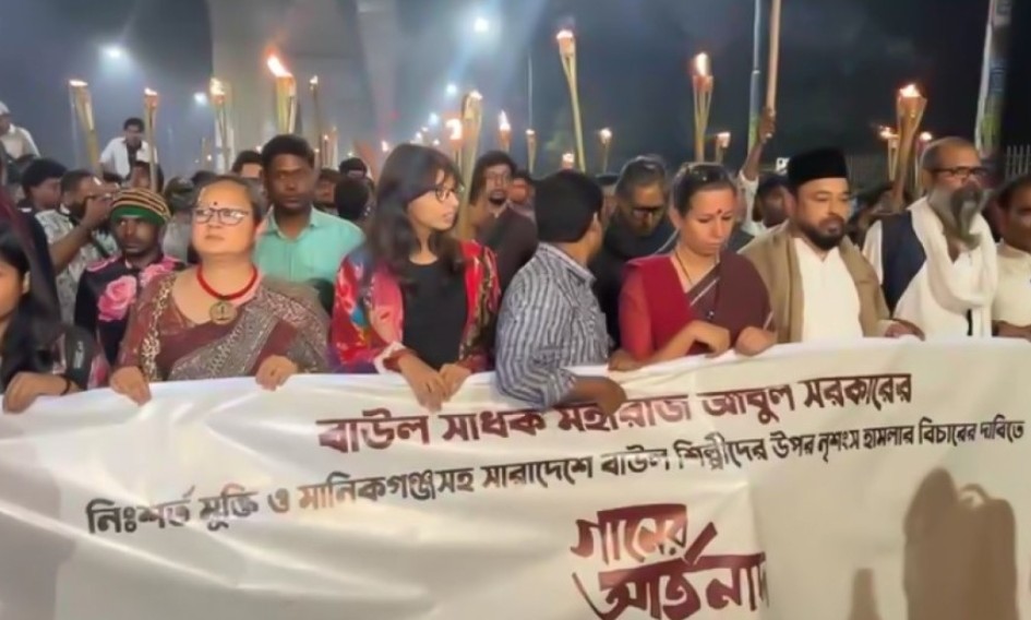 বাউল শিল্পীদের ওপর হামলার বিচারের দাবিতে মশাল মিছিল করেছে ‘সম্প্রীতি যাত্রা’