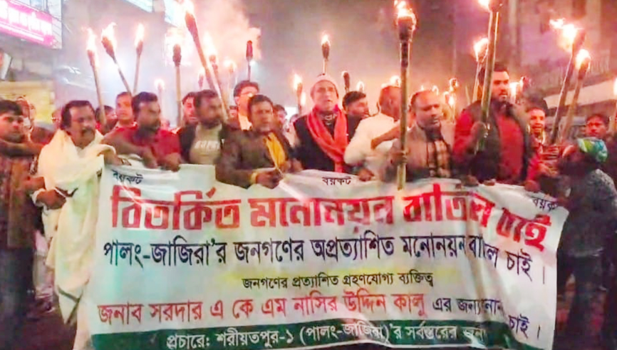 শরীয়তপুর-১: নাসিরউদ্দিন কালুর মনোনয়নের দাবিতে বিএনপি নেতাকর্মীদের মশাল মিছিল ও বিক্ষোভ