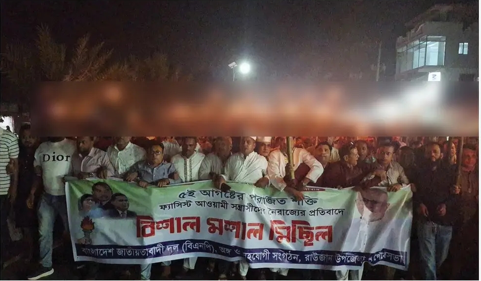 রাউজানে বিএনপির মশাল মিছিল: “শেখ হাসিনা ভারতে পালিয়েছে, দোসরদেরও পালাতে হবে”