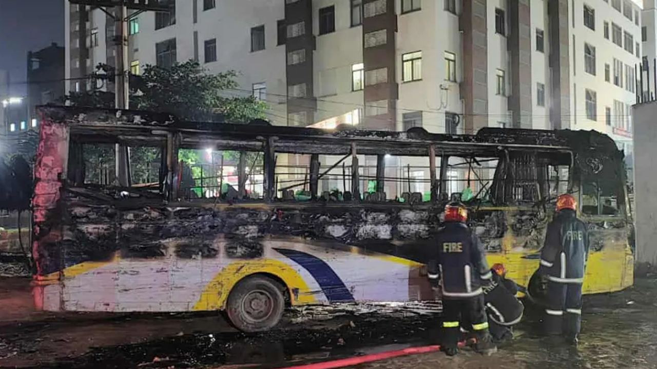 সাভারের আশুলিয়ায় পার্কিং করা বাসে আগুন, চালক আহত